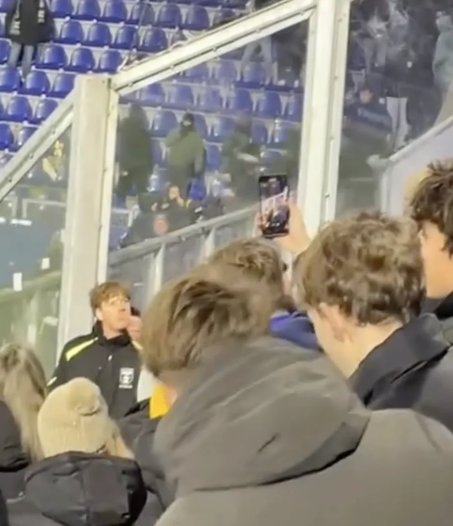 Volgens aanwezigen leidde een mislukte poging tot provocatie tot een bijna komische, maar gevaarlijke situatie toen de supporter een sprong maakte en direct werd gestopt door de harde constructie, waardoor omstanders zichtbaar schrokken en beveiligers onmiddellijk ingrepen.