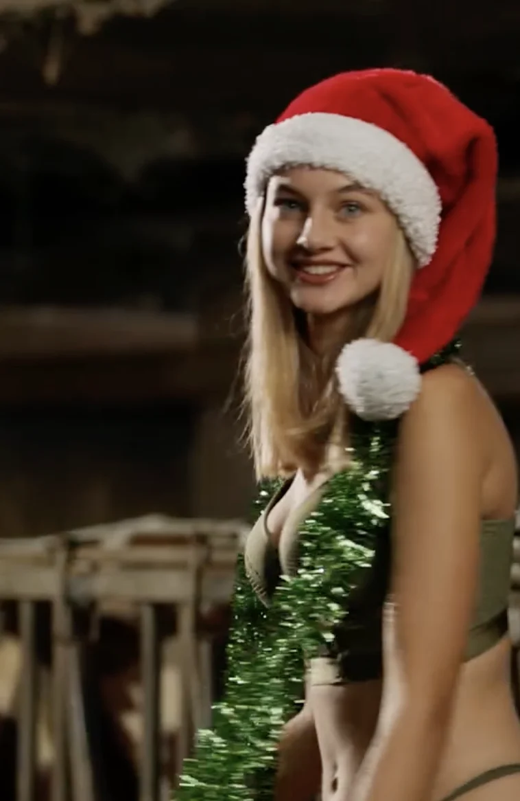 Ook de keuze voor groene lingerie en een kerstkrans is niet willekeurig, omdat kleuren en symbolen direct associaties oproepen met het seizoen, terwijl de uitvoering luchtig blijft en niet zwaar leunt op traditionele kerstbeelden.