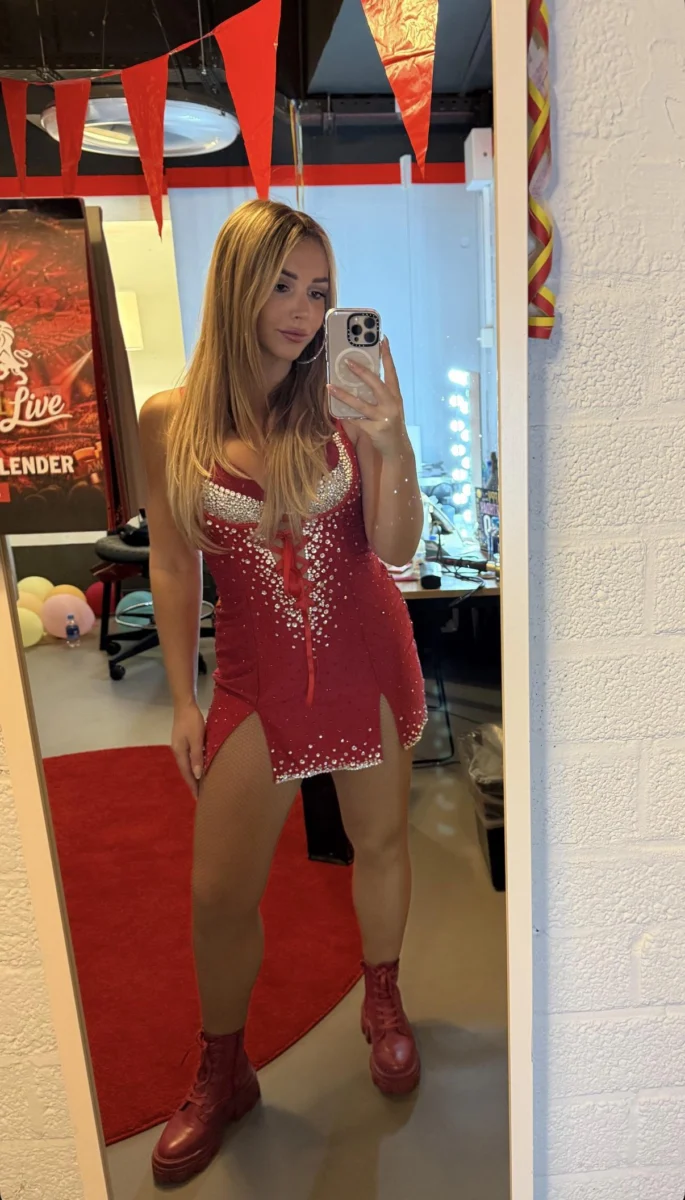 De zangeres deelde na afloop een backstage foto op haar Instagram, gemaakt via een spiegelselfie. Het rode pakje dat zij droeg, zorgde voor een krachtige visuele indruk en benadrukte haar zelfverzekerde uitstraling tijdens een van Nederlands meest besproken muziekevenementen.