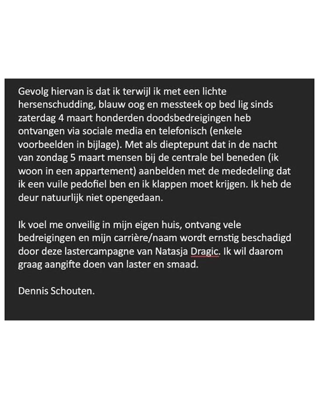 De reactie van Dennis, die hij doorzet als aangifte: