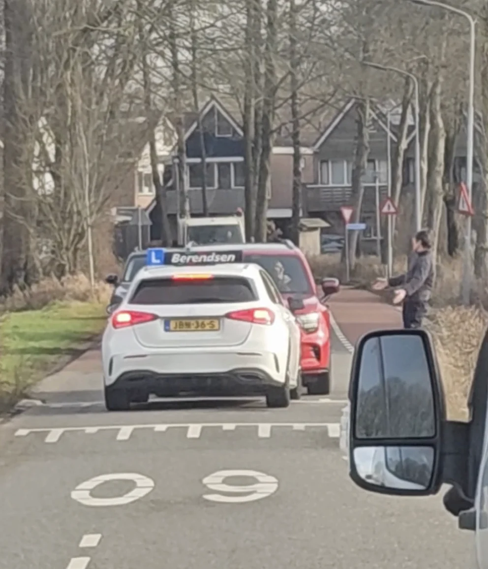 De lesauto bleef staan, de tegenligger bleef staan, en het dorp leek even stil te vallen. Voor omstanders was het bijna vermakelijk, maar voor de leerling voelde het waarschijnlijk als een onverwacht examenmoment midden op straat.