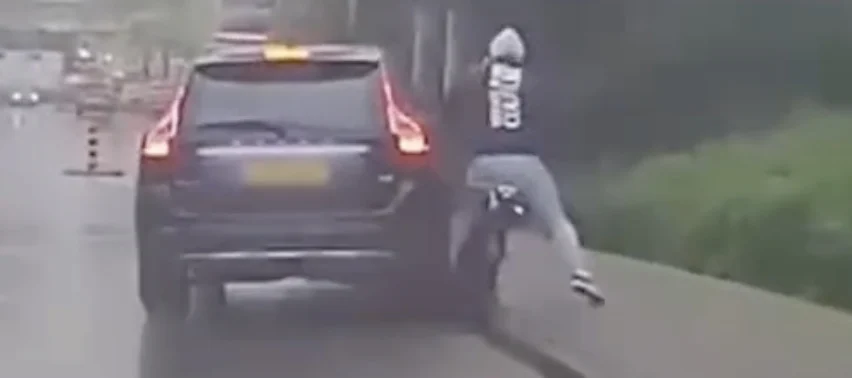 Vervolgens is te zien hoe de jongeman met kracht op het zijraam van het voertuig slaat, wat de spanning verder doet oplopen. Deze handeling wordt door veel kijkers geïnterpreteerd als een poging om schade toe te brengen of de inzittenden te intimideren.