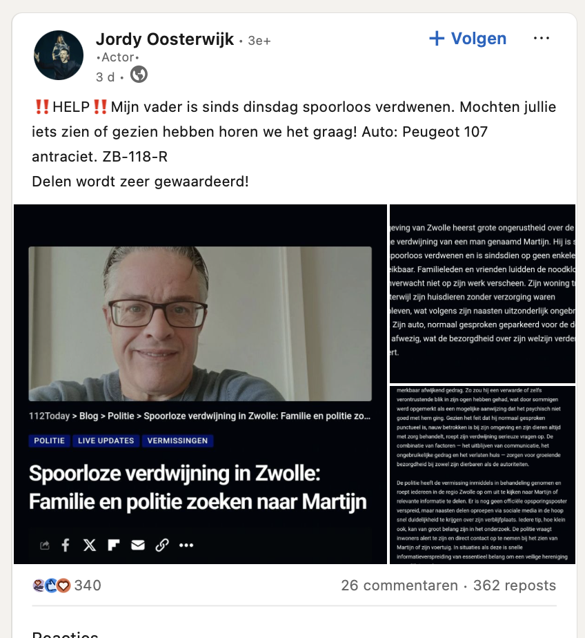 In het LinkedIn-bericht van zijn kind klinkt een rauwe, maar krachtige emotie. Er wordt niet om medelijden gevraagd, maar om actie. Een helder verzoek om te kijken, te luisteren, te herinneren. Iets dat de sleutel kan zijn naar zijn terugkeer. Of tenminste naar duidelijkheid.